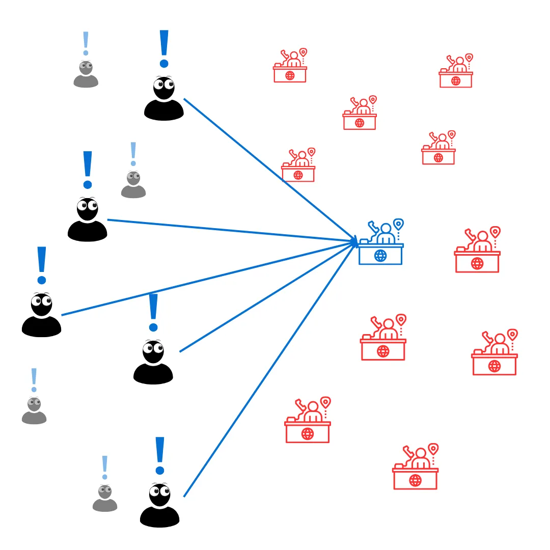 Il proprietario di casa (l’omino) viene raggiunto da tutte le agenzie immobiliari, ma ai suoi occhi sono indistinguibili: tutte uguali, tutte 'rosse'.